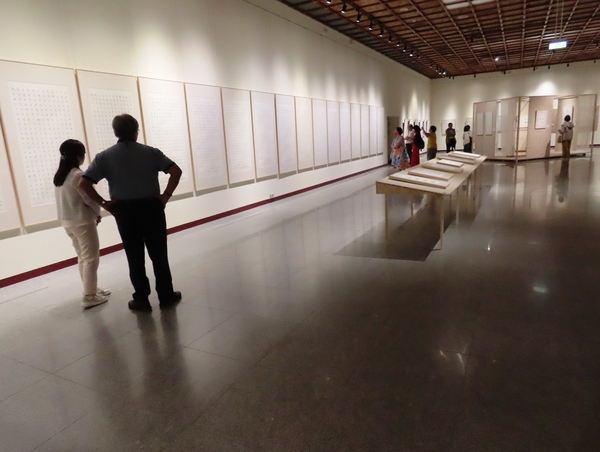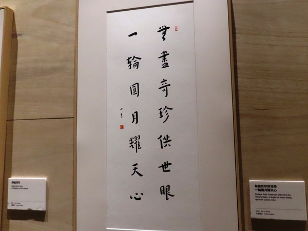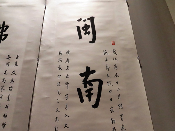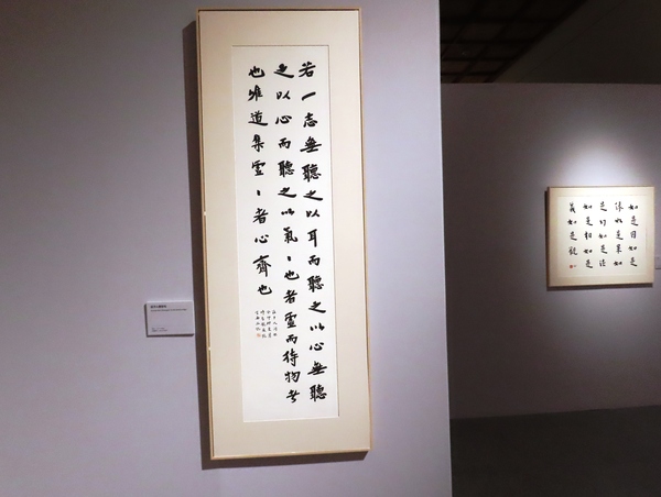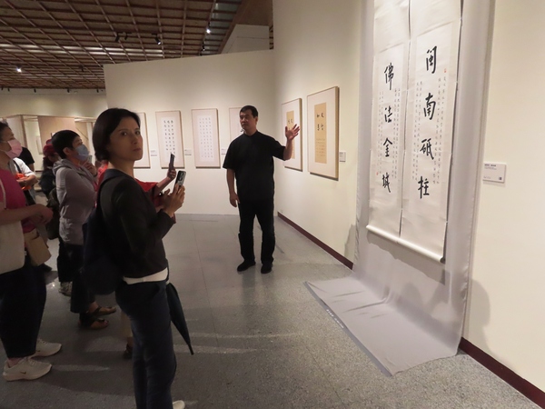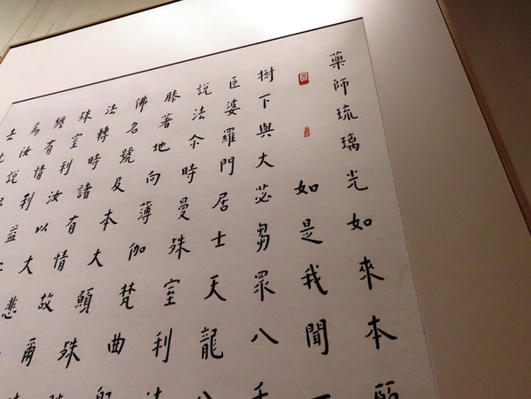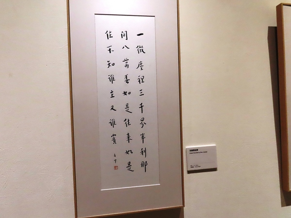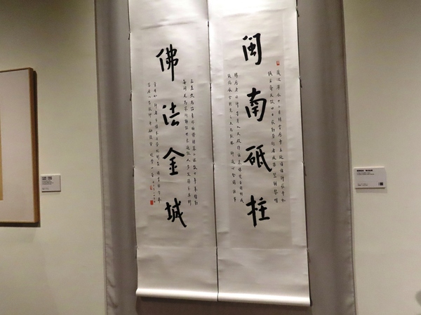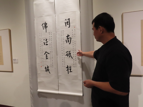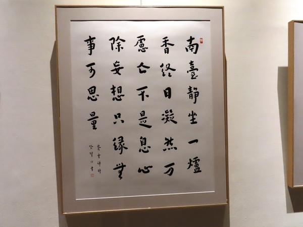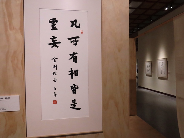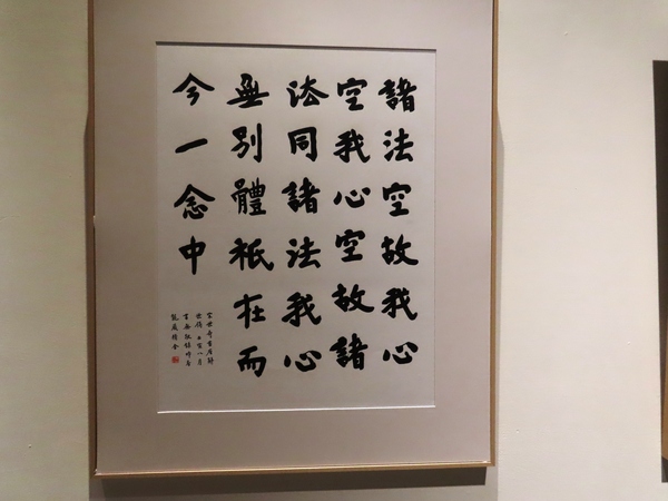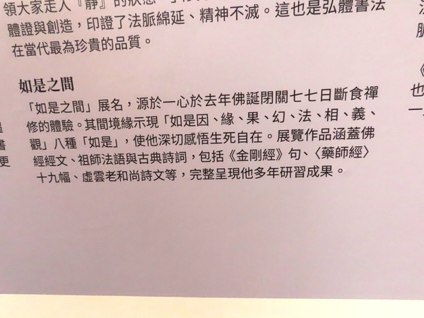 此次於中正紀念堂舉辦的「如是之間・一心弘體書法藝術展」,將完整呈現一心師多年來對弘體書法的研習與創作。展品涵蓋佛經經文、祖師法語以及經典詩詞,如〈金剛經〉句、〈藥師經〉19幅、虛雲老和尚詩文、〈道德經〉摘抄等,其中〈閩南佛法四言聯〉,是一心曾在泉州開元寺的弘一法師紀念館見聞大師真跡,深受觸動後的背臨之作,體現其堅固的道念與信心,在字義上,「閩南」與臺灣亦有呼應之處,期待與觀者產生更多共鳴。