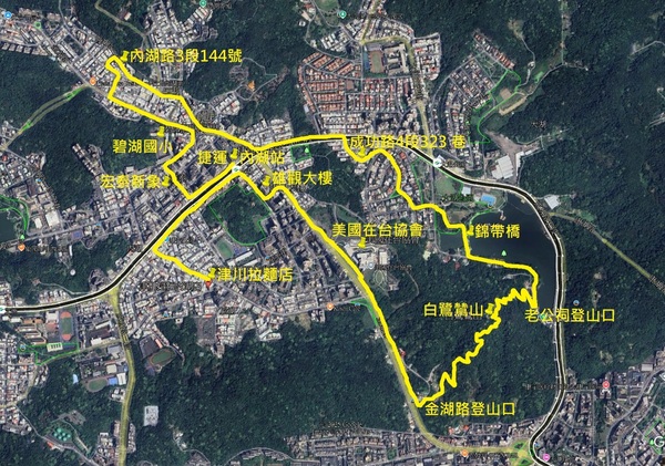 捷運內湖站→宏泰新象 (第1處故居) →碧湖國小→內湖路3段144號 (第2處故居) →成功路4段323巷 (第3處故居) →錦帶橋→老公祠登山口→白鷺鷥山→金湖路登山口→美國在台協會→雄觀大樓 (第4處故居) →津川拉麵店