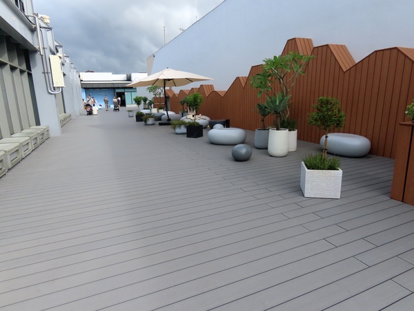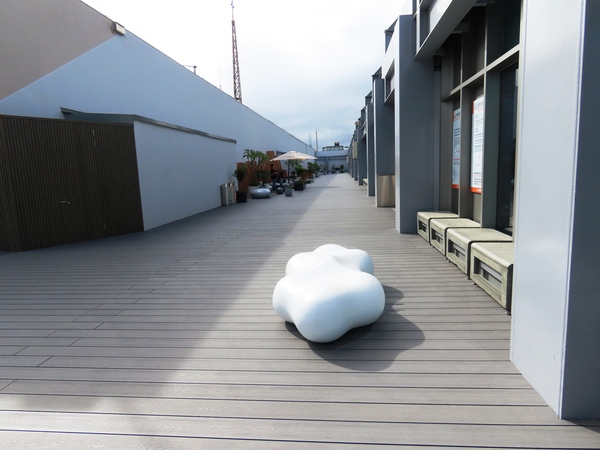 休憩設施: 設有雲朵和鵝卵石造型的座椅區,搭配多樣化的植栽,營造親善自然的休憩環境。