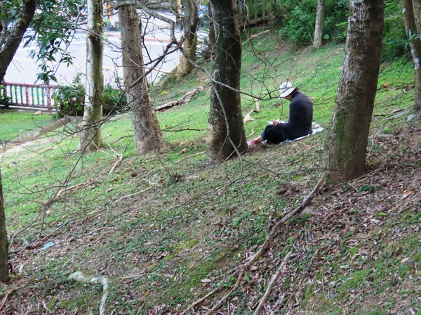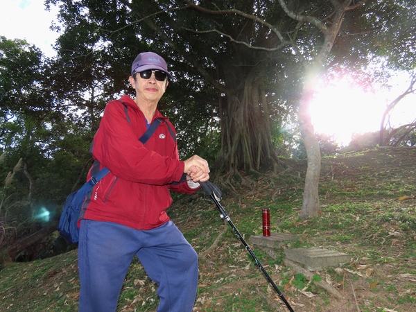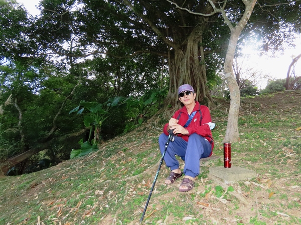 雖病體微恙,心脈不順,致步履蹣跚、氣喘促促,然心念所繫,仍欲往密地「東坡咖啡座」一舒胸臆。是日,手持孤杖,身著絳衣,獨坐於老榕氣根蔭下,面對青山如舊,雲影飛禽往來無心。