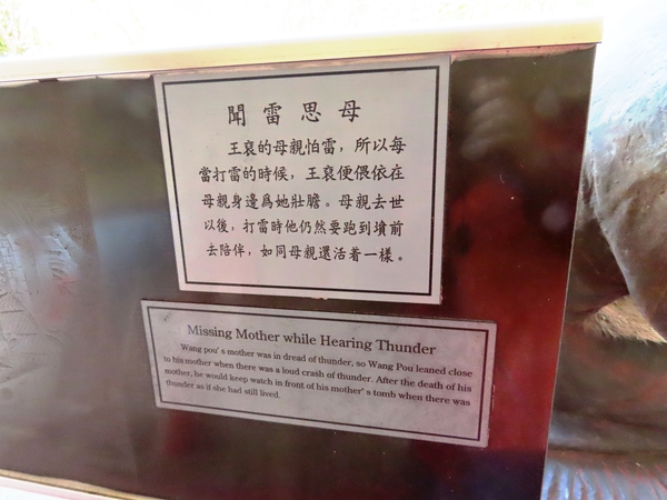 感人情節: 母親去世後,王裒只要聽到雷聲,不管風雨有多大,都會立刻跑到母親墓前告訴母親不用害怕。