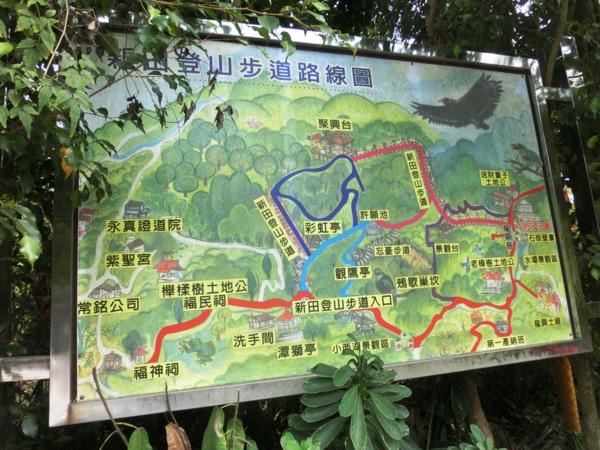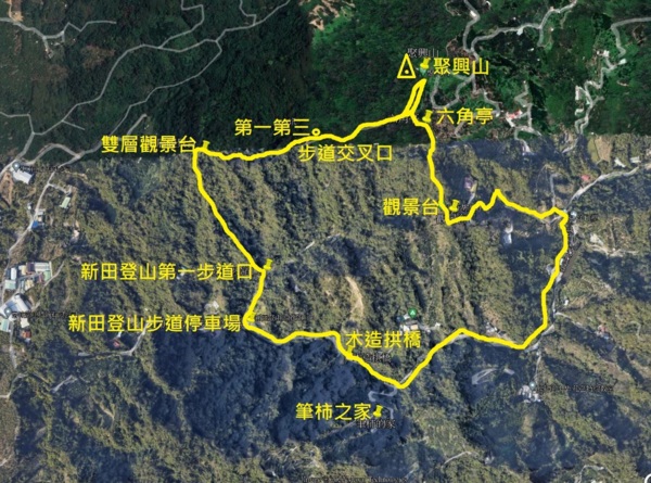 聚興山與新田登山步道共有三條步道相接合,其中一號步道由1063階枕木舖設,稍有陡度,每50公尺有設里程碑,沿途樹木蒼鬱茂密,順著步道蜿蜒而上,聚興山尖尖的山頭即呈現在眼前,稜線有幾處展望點,可俯看潭子、北屯市區,以及果園景緻,步道設備完善有彩虹亭、觀景平台、六角亭、觀鷹台與許願池許多休憩涼亭。