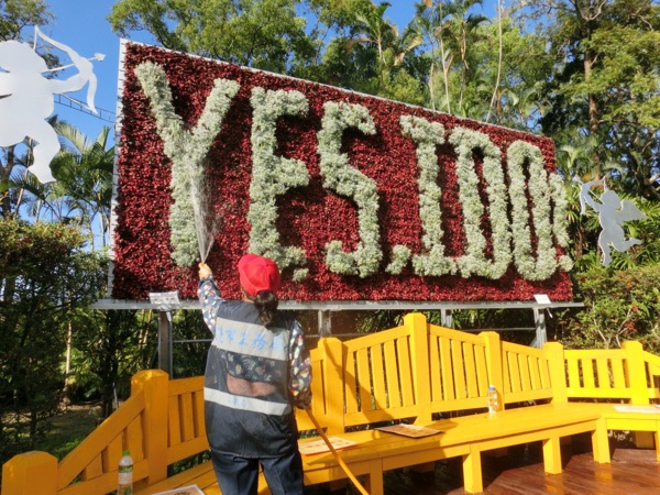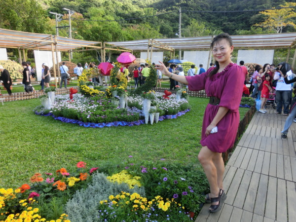 今年展場共有9區,戶外展區包括帶著新嫁娘濃濃愛意,鼓勵世人勇敢說愛的「愛の告白之愛要勇敢說出來」、由菊花演繹愛情迷網面及友情意氣相挺或親情無私奉獻的「原來是愛」、稀有的巧克力波斯菊呈現的「師生情懷」、以嫁接菊塑形成婚禮蛋糕及求婚鑽戒的「約定」、讓你決定相守一生的「Yes, I do!」平台及迷住戀人雙眼的「情網」。