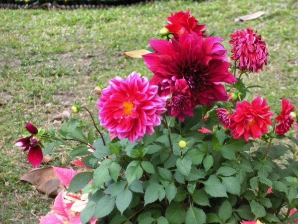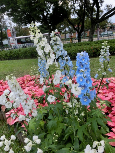 展場除了市面上常見的大紅色、粉紅和鵝黃色等單色聖誕紅外,還使用了粉白斑點如雪花覆蓋在紅色火焰上的「粉冰火」、像似撒上金粉般亮麗的「紅寶石」,以及粉紅和黃色交錯的「馬貝拉」等少見的多色品種。
