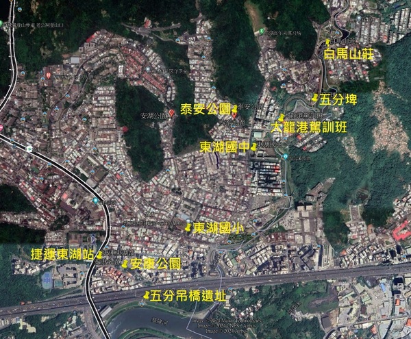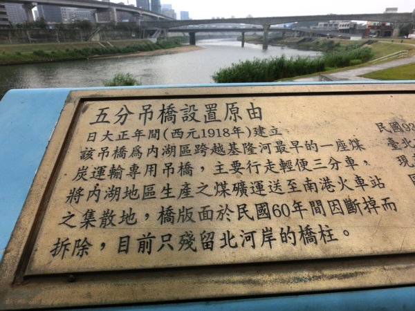 五分吊橋遺址位於台北市內湖區五分里康路414巷南側的堤防外,建於日治時期大正七年(民國7年),是內湖區跨越基隆河最早的一座煤炭運輸專用吊橋,橋面架設輕便鐵路,主要行走輕便三分車,運輸內溝地區五份、聯豐、叭嗹煤礦和大湖地區的友華、蓬萊煤礦,以及大湖公園旁的豐田煤礦所產的煤炭,送往南港儲煤場,再利用火車轉運外地,對地方經濟產業貢獻良多。