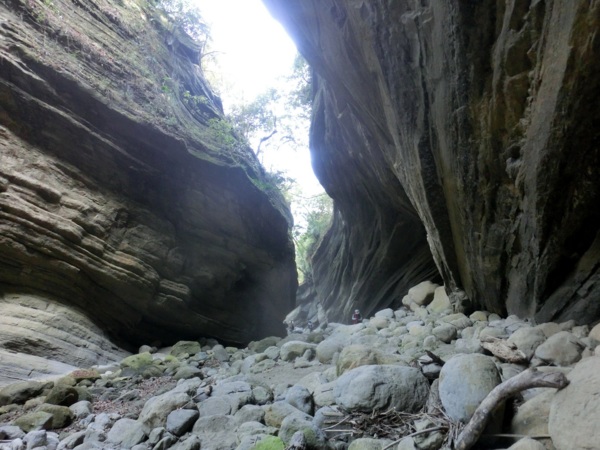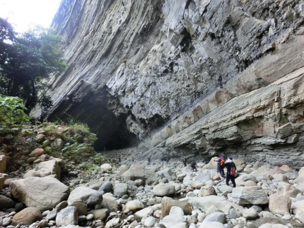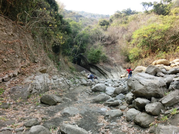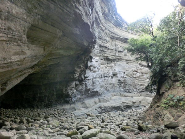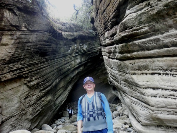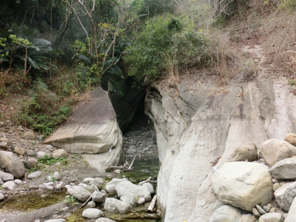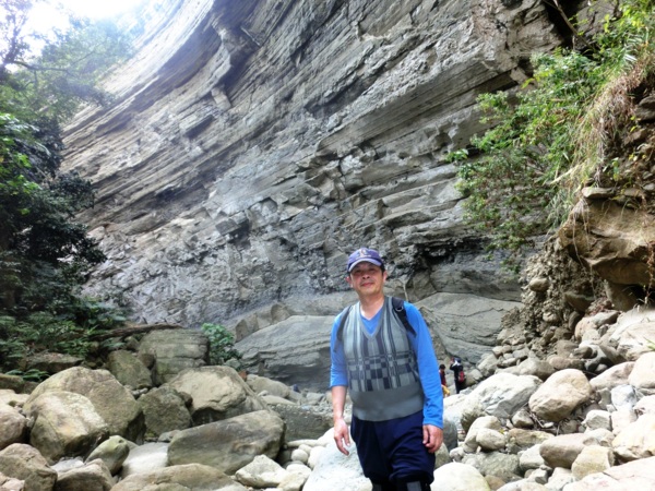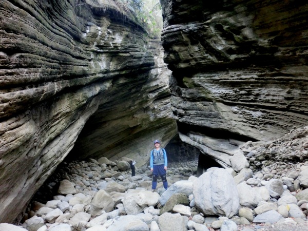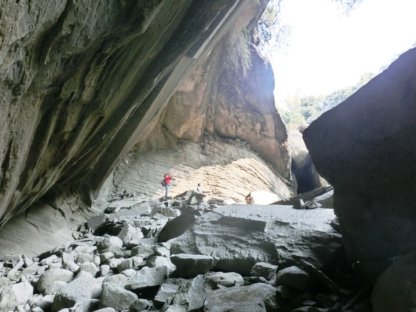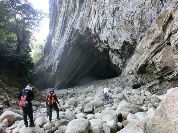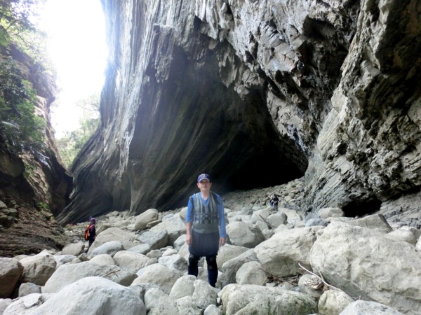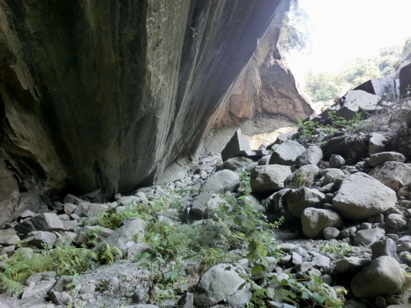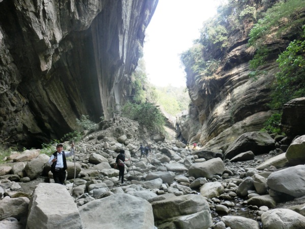 14:05 入洞後豁然開朗,崖壁高聳,地上危石壘壘,須小心前行