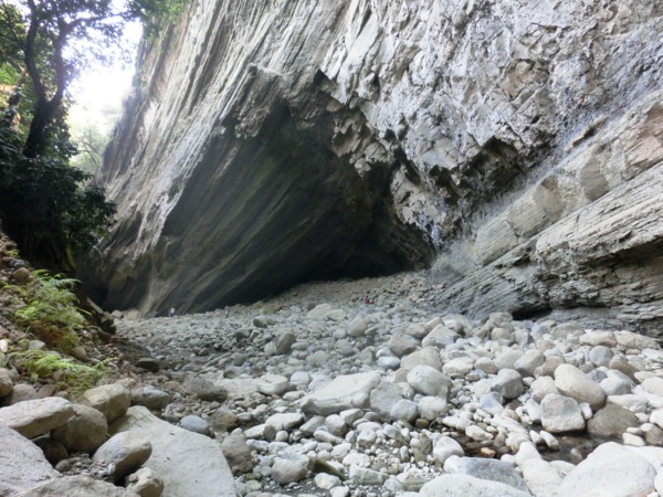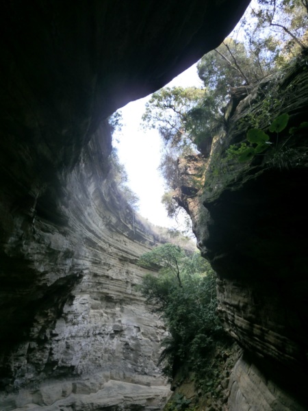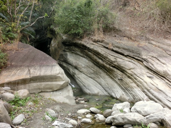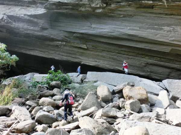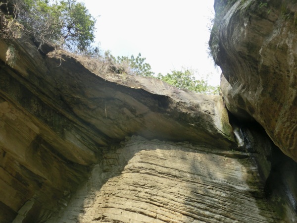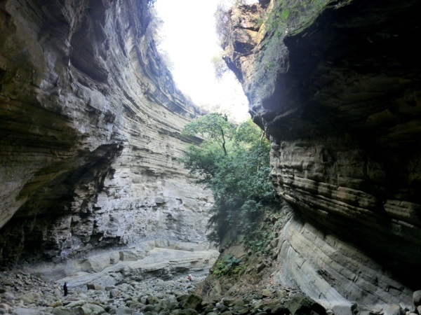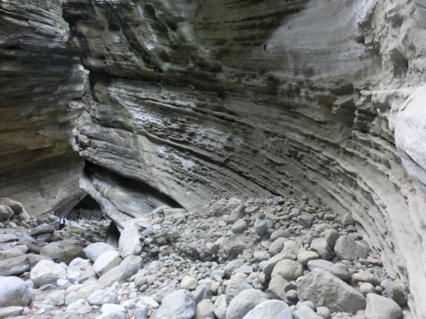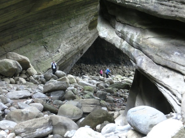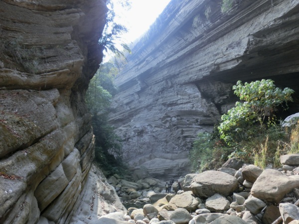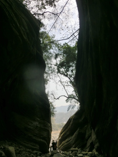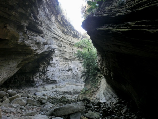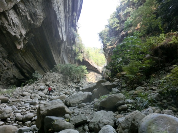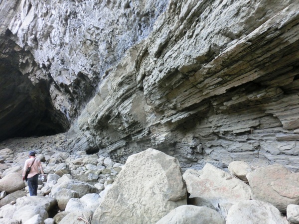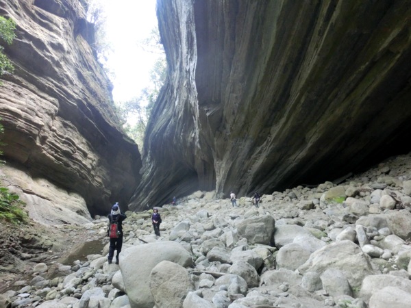 14:05 入洞後豁然開朗,崖壁高聳,地上危石壘壘,須小心前行