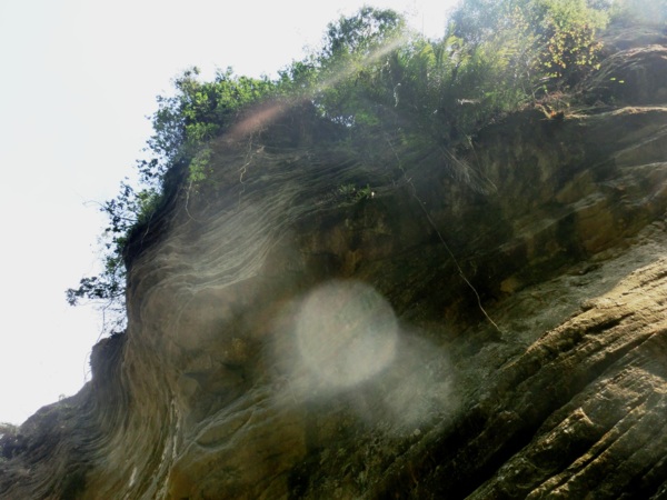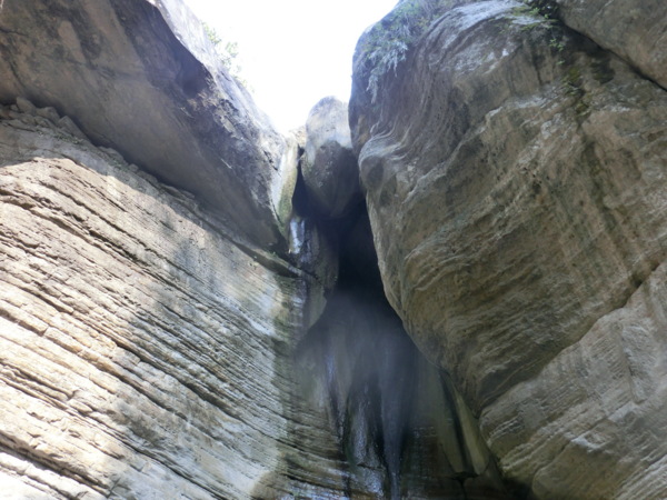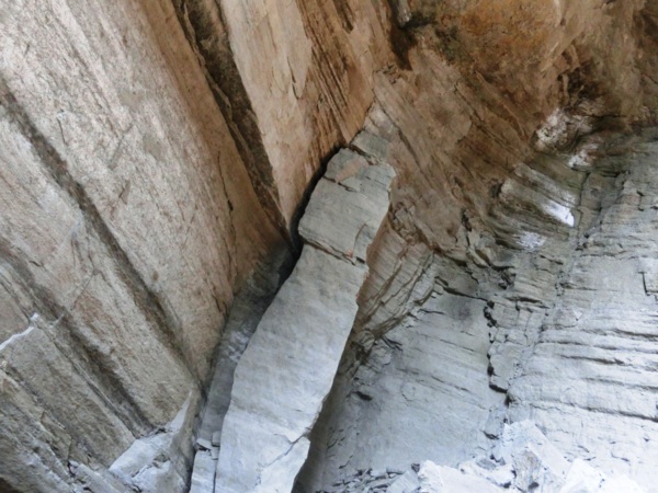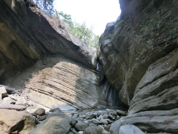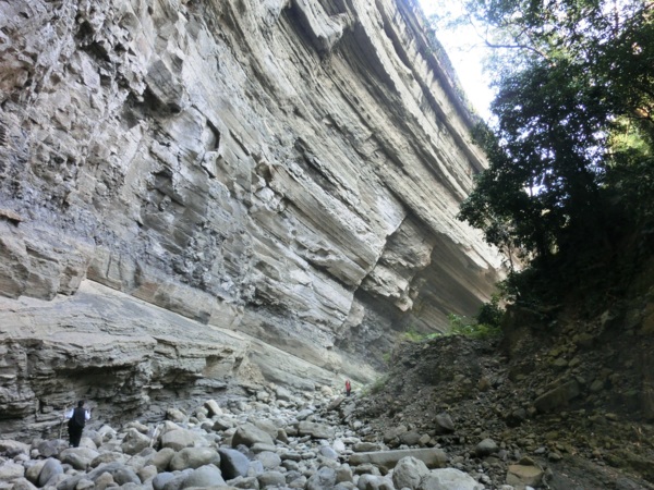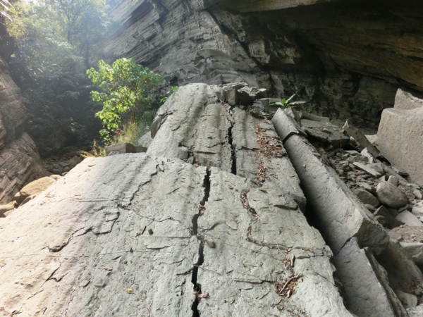 一層層堆疊的頁岩山壁不定時剝落,更添增危險性,地上隨處都可看到一塊塊頁岩落石,要是不小心,砸下來力道可是很驚人;走到最深處,因為長期大水沖刷,形成一個峽谷的地形,因為長期風化,山壁上的頁岩隨時都有掉下來的可能。