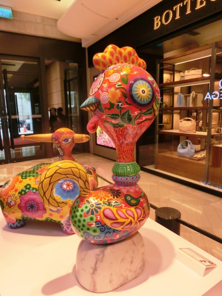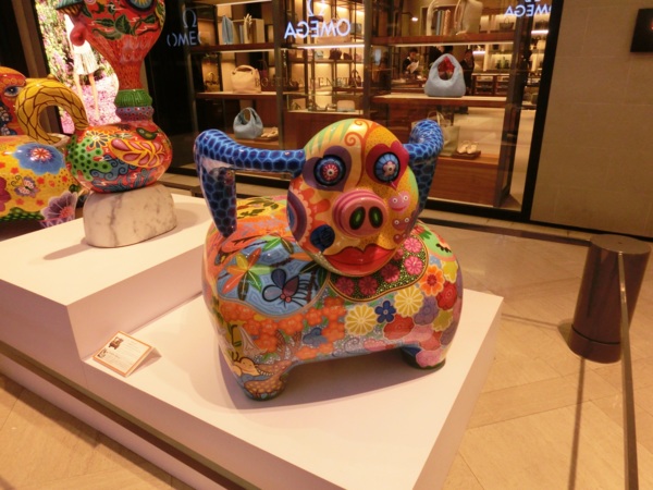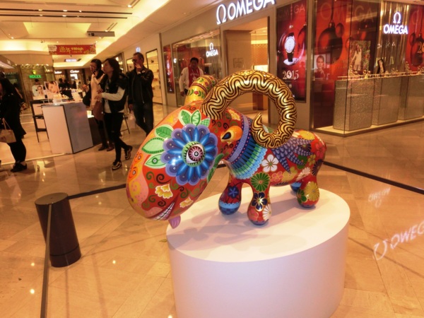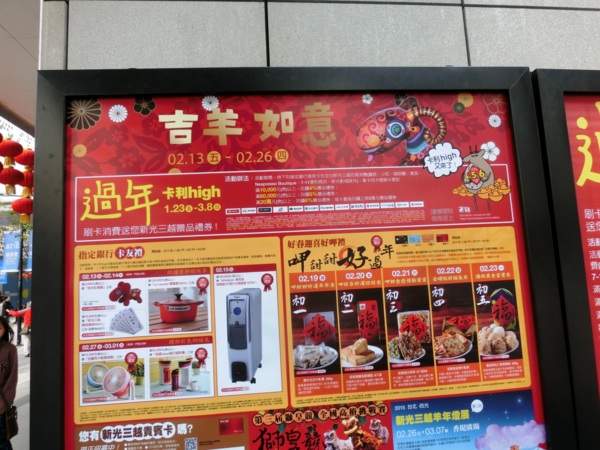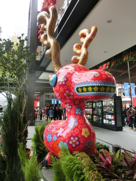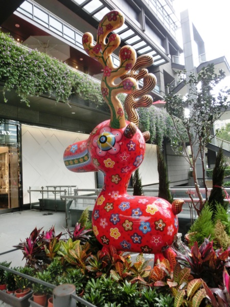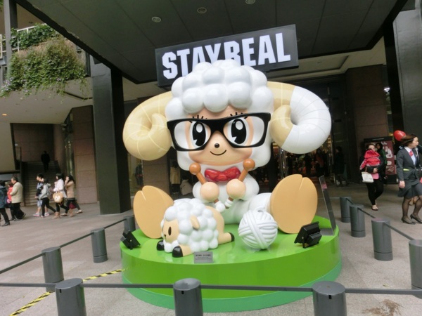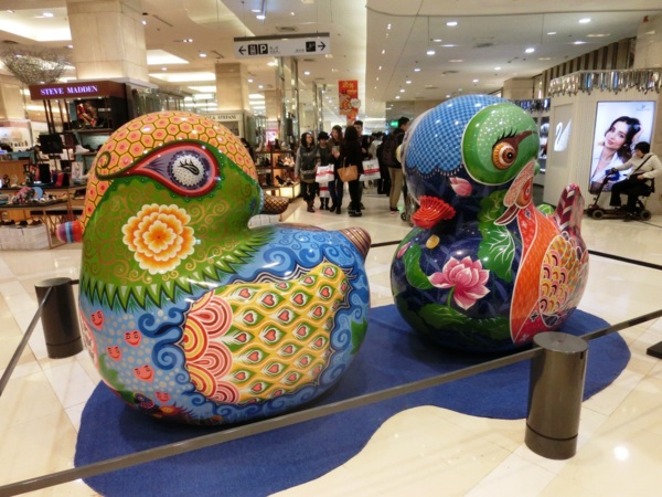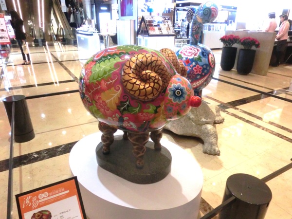 洪易今年的作品「遍布」新光三越信義新天地,走到A9大門入口,就能看到洪易為羊年創作的全新作品《山羊》,作品上滿是花卉,表現熱帶花鳥國度的台灣意象,充滿喜氣的風格,成為新光三越今年春節的主視覺。