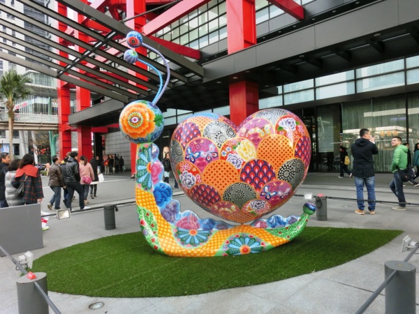 《愛心蝸牛》的蝸牛背著愛心形狀的殼,希望提醒來往旅客或上班族試著放慢腳步,才能感受生活中的小細節