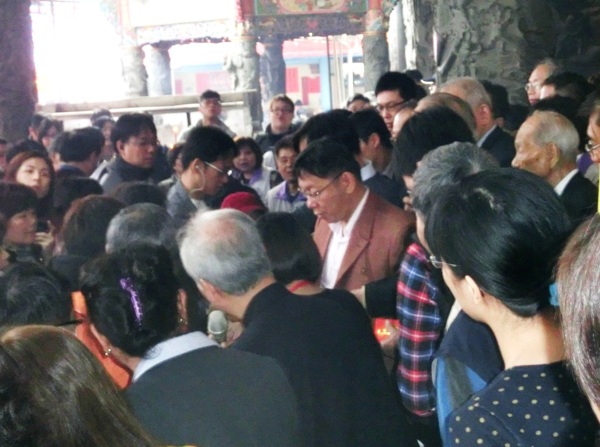 臺北市長柯文哲20日一早開始,就先後參拜松山慈惠堂、奉天宮、指南宮、木柵、景美集應廟、芝山岩惠濟宮與慈諴宮,受到虔誠信徒們熱烈歡迎他除祈求臺北市順順利利外,更祝福參拜的善男信女們身體健康、萬事如意,發大財,快快樂樂地過每一天的日子。