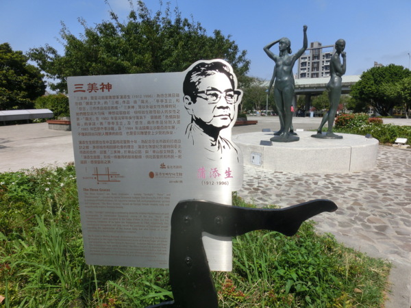 台北市文化局說,蒲添生後代捐贈「三美神」銅像,不僅增添藝術景觀,也是台灣首個戶外裸體雕塑公共藝術。台北市長郝龍斌今天也親自出席主持銅像揭幕儀式。