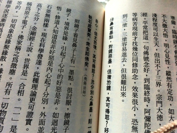 照鏡子看見鼻子上有一墨點,很討厭,擦鏡子一定沒有用。外面的如同鏡子,境界是緣,引起了心中的好惡是非。如迴光返照,觀察自心,即能覺悟。修道人知道是非好惡是內心起了分別,外面並沒有是非好惡。石頭與寶石並無兩樣。現在科學發達,此種理論更可證實。萬法平等,萬法一如,無高下之分。《金剛經》上說,世界是一合相。「一」是科學家說的基本物質,或稱為原子電子,佛家稱之為微塵。所有一切物質均為它的組合,一合相是平等的,一切現象是緣聚緣散,緣聚則生,緣散則滅。一切萬象不生不滅,此種學說逐漸將為現代科學所證明。我們起了錯覺,才有善惡是非。眾生與佛亦無差別。石頭是一合相,寶石也是一合相,只是化學的方程式排列不同而已。