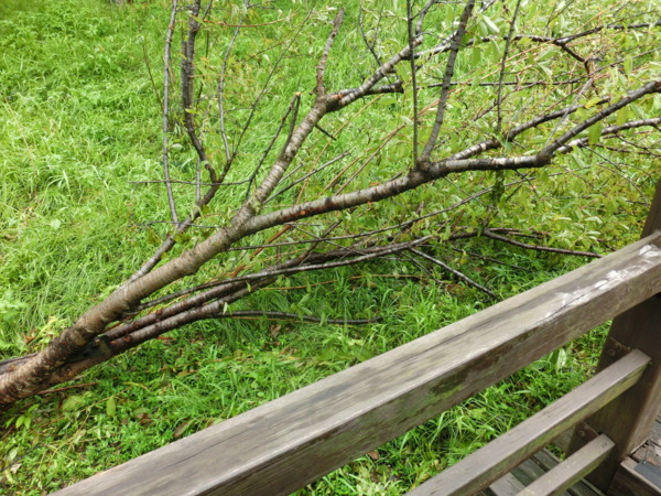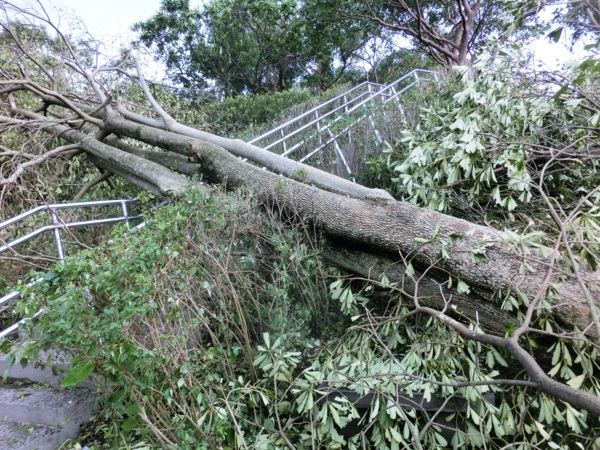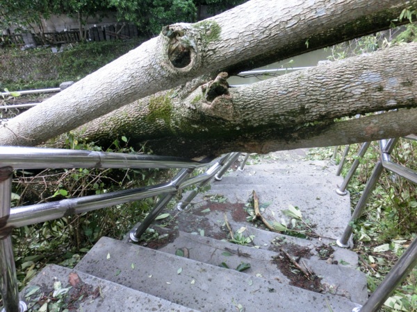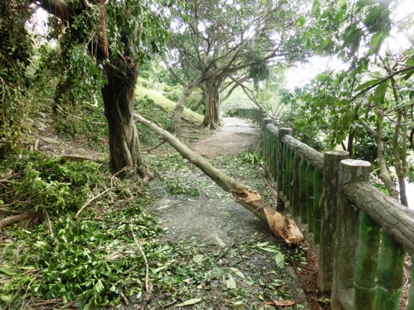 木棧道口被倒下的苦楝樹擋道