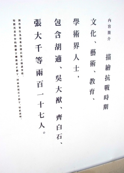 其中名為《血肉長城》畫卷,繪製二百十一名為抗日犧牲的高級將領,中國共產黨僅五人,其餘全是國民黨將領。大陸畫家們並特別繪製《青天碧海》畫卷,紀念羅福星、莫那魯道、丘逢甲、連橫、林獻堂和蔣渭水等台灣抗日志士。