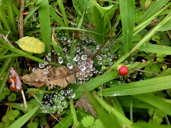 蛛網上的水珠與蛇莓