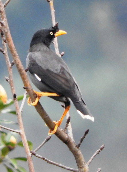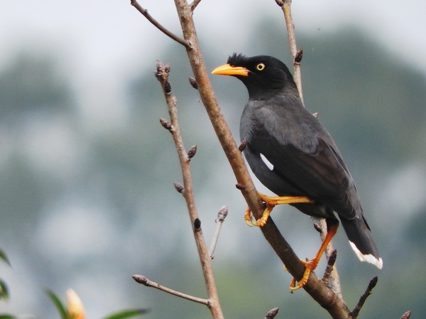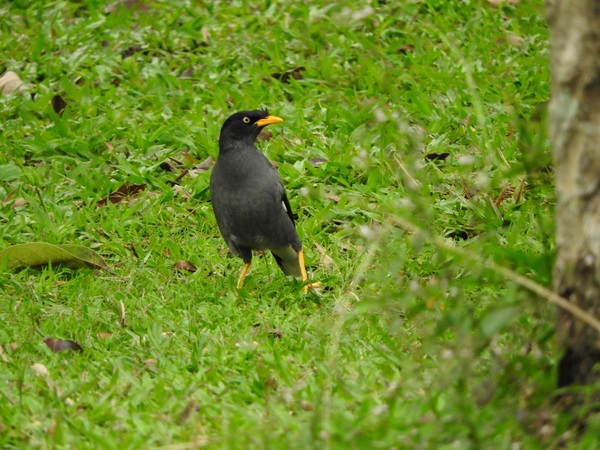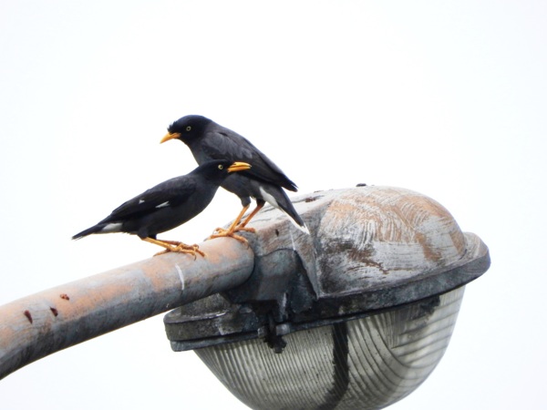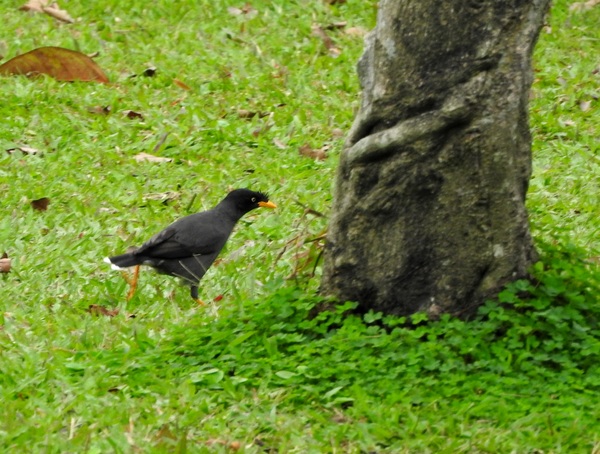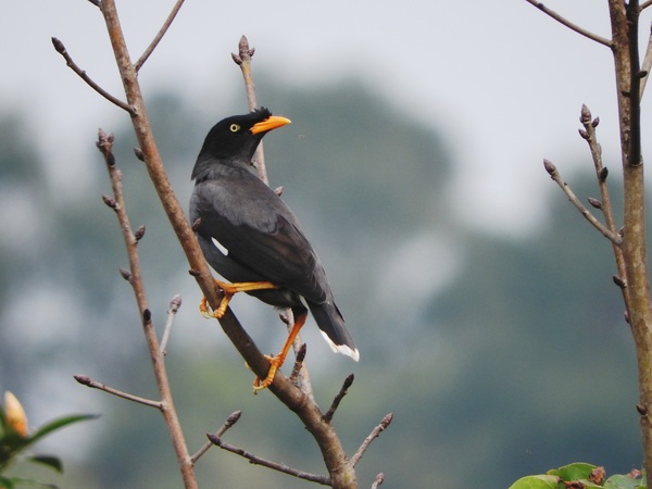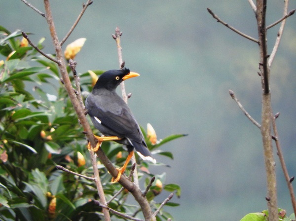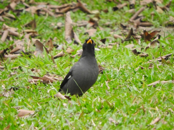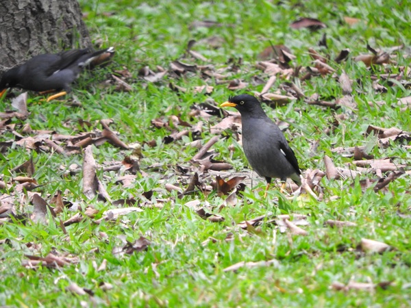 外來強勢種的白尾八哥 (八哥科) 體長約26cm,外觀近似本土種的八哥,但其嘴為橙黃色,先端乳白色,腳橙黃色。本圖為白尾八哥,為籠中逸鳥,嘴喙及腳為黃色,上嘴基部有黑色羽毛豎起,尾下覆羽是白色,所以稱之為白尾八哥。常成群出現於開闊草地,公園、學校可見,飛行時會發出「啊、啊、啊」的粗啞聲,也會模仿其他鳥類或人類的聲音。