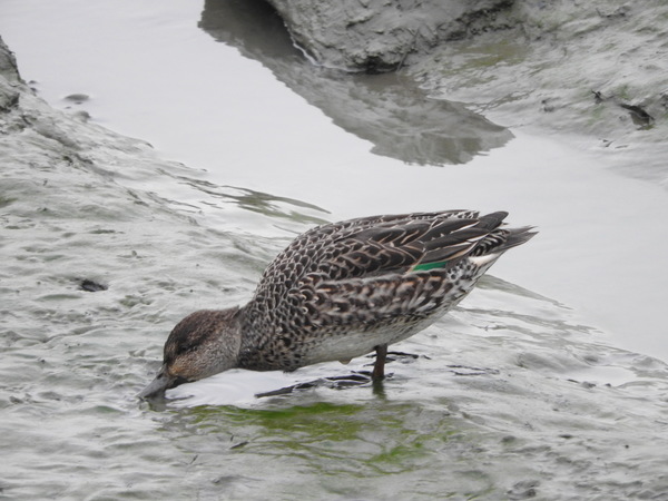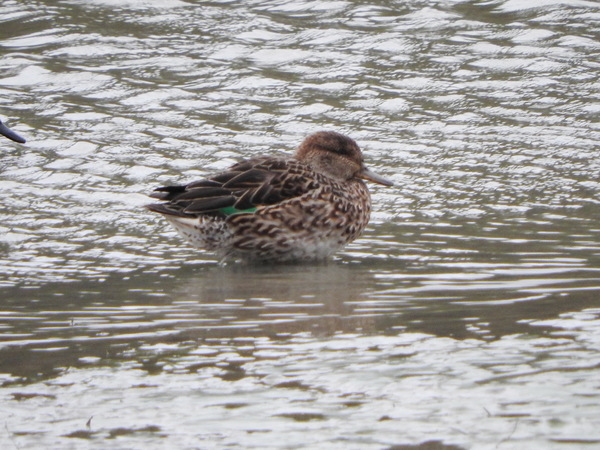 雌鳥為雄鳥的暗色版本,通體以褐色為基調,並不具有雄鳥所具有的「面部大逗號」、「體側白線」和「奶油屁股」這三大特徵,但雌鳥保持了翠綠色的翼鏡,並有著非常小巧的身材,這都是本物種雌鳥的鑑別特徵。虹膜褐色;喙和足均為灰色。