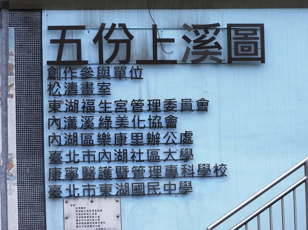 內湖社大講師陳金讚表示,水利處近期施作內溝溪綠美化工程,地方人士建議在堤坊邊設置文化走廊,他整合意見後,提出「五份上溪圖」的構想。早期東湖一帶就叫「五份」,圖畫的時代鎖定在近百年前,涵蓋春耕、夏耘、秋收、冬藏。
