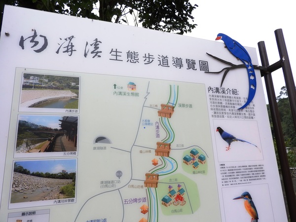 內溝溪自然生態步道由三段不同步道組合而成,從上游到下游分別為「內溝步道」、「五分碑步道」、「樂康步道 」。