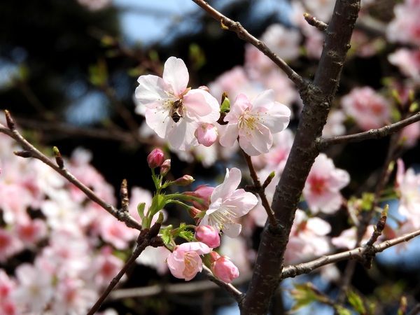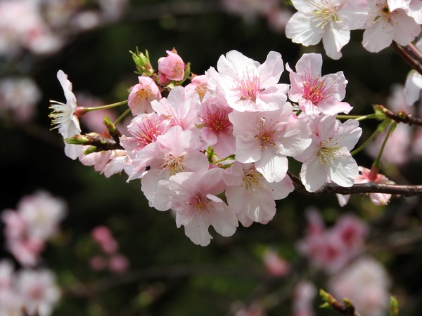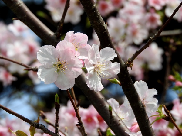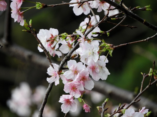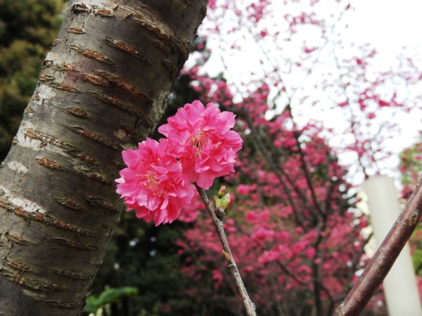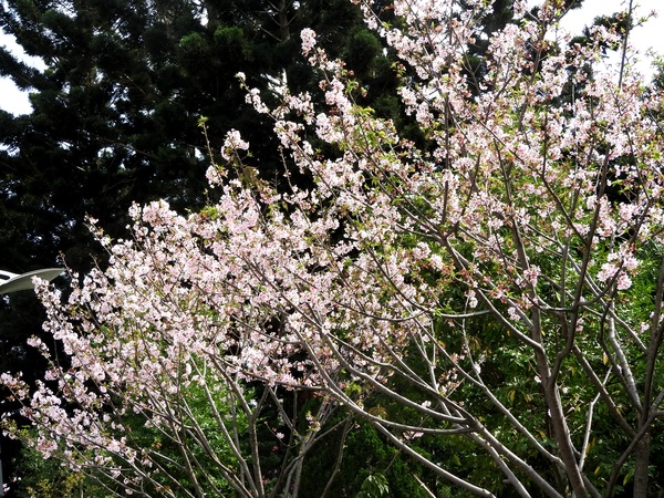 | 花期早,大島櫻的實生變種,樹高呈傘狀樹姿,在日本花期早在2月下旬,因花色呈鯛魚的顏色而命名。花瓣5枚,偶有旗瓣出現。花開後長葉。果實呈黑紫色球形,帶甜味。此種種植於環堂道路後方,花期為每年2~3月。 |