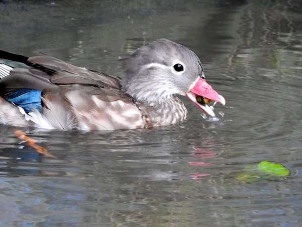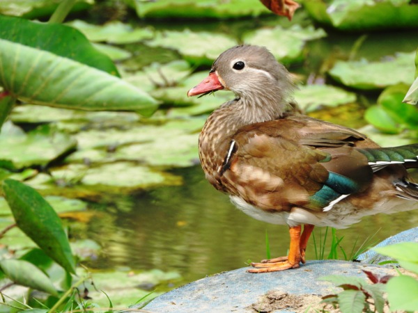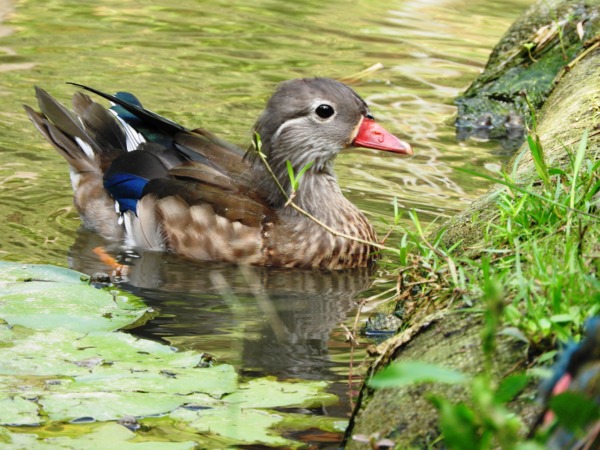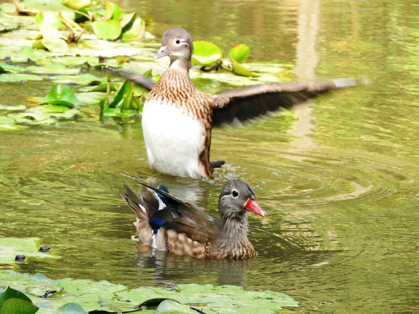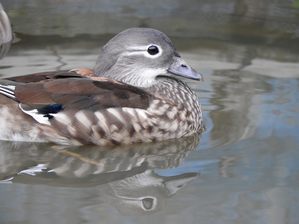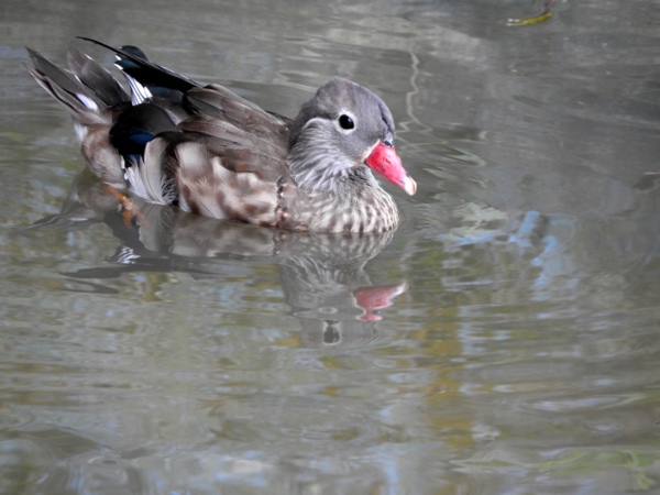 雌性鴛鴦遠不如雄性鴛鴦漂亮,通體顏色為暗啞的灰色,也不具有雄鳥所具有的「帆狀三級飛羽」雌鳥的辨識特徵為鮮明的白色貫眼紋,喙灰色。