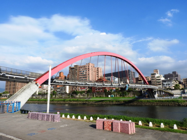 彩虹橋全長167公尺,是連接內湖區新明路及松山區饒河街,橫跨基隆河的一座橋樑,造型特殊,由橋中央的四條主要鋼纜吊索支撐,橋的結構為S型的曲線橋體,鮮紅色鋼肋拱型梁結構,附屬設施為木質欄杆、粉紅及淡藍色地磚,為一座新穎的地標性公共設施。