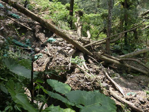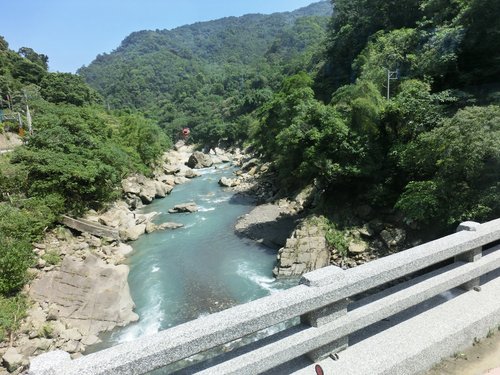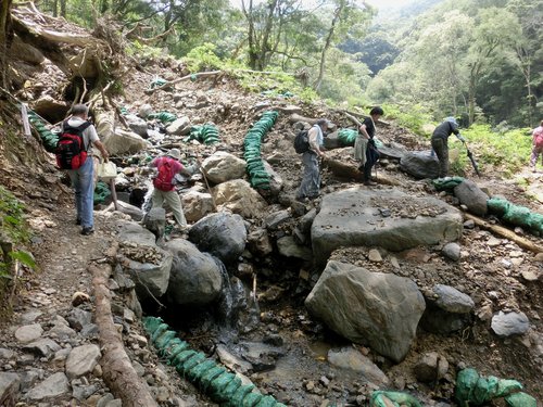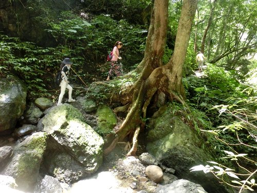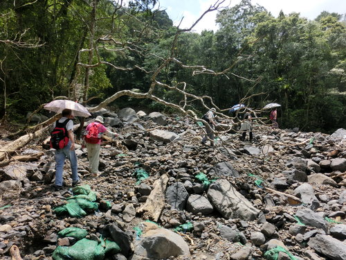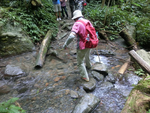 12:06 往雲心瀑布的溪谷木橋因颱風而消失,只好冒險渡溪