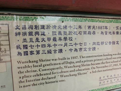 大甲文昌祠(又稱大甲文昌宮),於民國七十四年(1985年)11月27日公告為三級古蹟。原為義塾,建於大甲城西門的舊大甲街西側,主祀文昌帝君、朱熹、韓愈、魁星。二戰後後配祀孔子,亦稱「大甲孔子廟」。清同治年間,大甲人何清霖(同治六年丁卯科舉人),經向官府請設義塾獲准,惟因經費龐大及廟地無著,一時無法齊備而作罷。光緒十一年(1885年)新竹知縣方祖蔭與恩貢生陳肇芳再度倡建文昌祠,經例貢生謝棠華捐花園地為廟址興建,光緒十三年3月興工,至十四年六月全部完成。