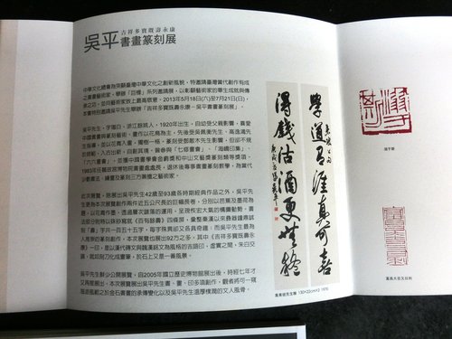 本次展覽展出吳平先生書法、繪畫、篆刻等多項創作,其中包含吳平先生近百方篆刻作品及特地為本次展覽創作之多幅新作,特別是集三代秦漢以彛器鐘鼎鈢文之百壽連屏、以花青與水墨為主之數幅花卉作品等,可一窺吳平先生融合書、畫、印為一體,溫厚樸潤的文人風骨。