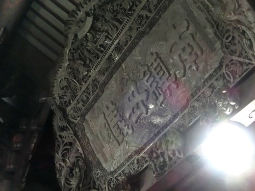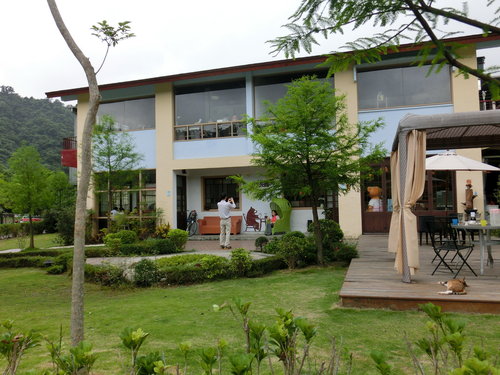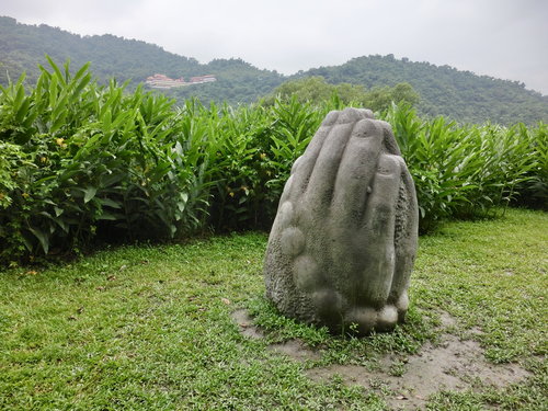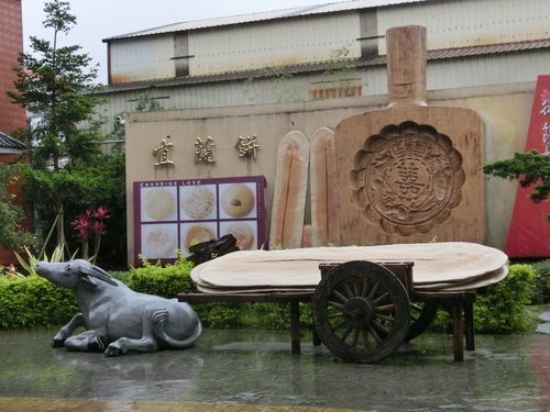 宜蘭餅發明館觀光工廠景觀廣場放置了超大餅模、牛舌餅和大型牛車,營造婚嫁習俗的喜慶氛圍。