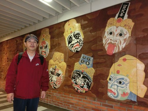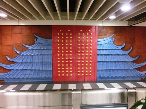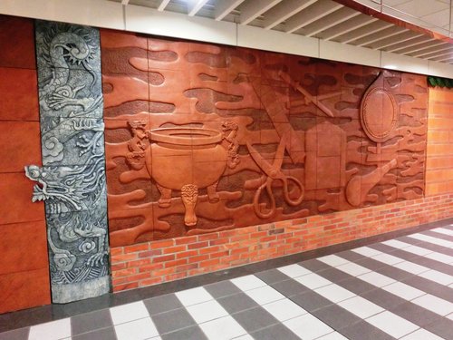 捷運行天宮站公共藝術作品創作「國泰民安」,以民間廟會活動為主題,將牆面設計分為祈安法會法器、八家將、平安福牌、廟宇建築、獅陣龍陣等五個區段,並以對稱的方式呈現,創造鮮明強烈、具代表性的宗教視覺意象。