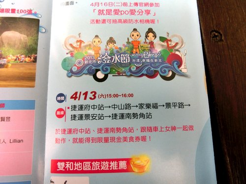 由新北市政府主辦的「二○一三新北市潑水節—水漾‧幸福在新北」系列活動,將於十四日在中和區華新街舉行浴佛、祈福、灑淨儀式,今年市府首度舉辦「創意潑水造型大賽」,歡迎民眾當天發揮創意,以特殊裝扮、自製潑水道具參加比賽。此外,還有「潑水除厄大作戰」、「就是愛PO愛分享」網路活動,相關訊息可至官網查詢,網址:http://www.ntpc-po.com/。