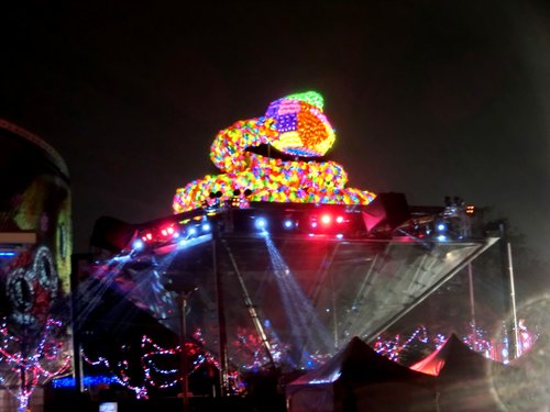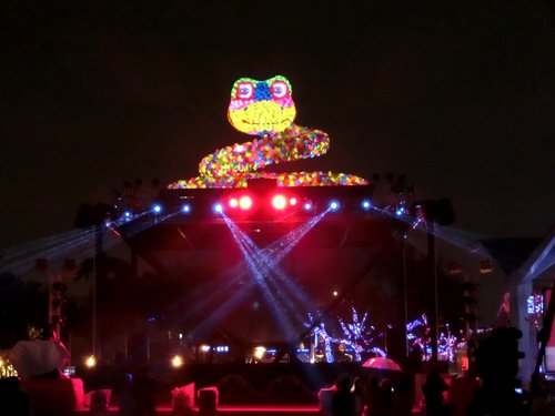 主展區21日到3月3日首度在花博園區展出,11天的燈節展期,其中的「蛇斑斑」劇場運用燈、光、聲、形的各種方式,展現創意。直徑9公尺 、高5公尺 的主角「蛇斑斑」於燈節期間,每晚7點至11點,每30分鐘一次,為大家帶來多元、更精彩的展演。