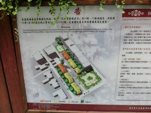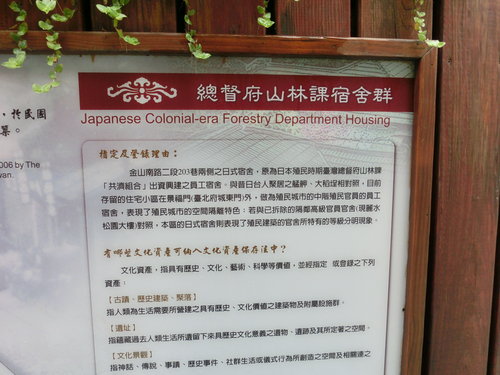 金山南路二段203巷兩側之日式宿舍,原為日本殖民時期臺灣總督府山林課「共濟組合」購置之員工宿舍。在國府接收後由林務局作為員工宿舍使用,因為沒有重大改建痕跡,15、17及22、24號兩棟日式建築完整率約八成,在2006年3月公告為台北市市定古蹟,其餘的19、21、23、28、30、34、36號登錄為歷史建築物,11及13號宿舍因火災燒燬,宿舍基地己規劃成為原生植物區。