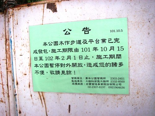 14:44 發現富陽生態公園入口貼著因施工101.10.15~102.02.01暫停開放布告