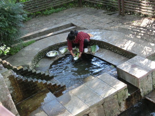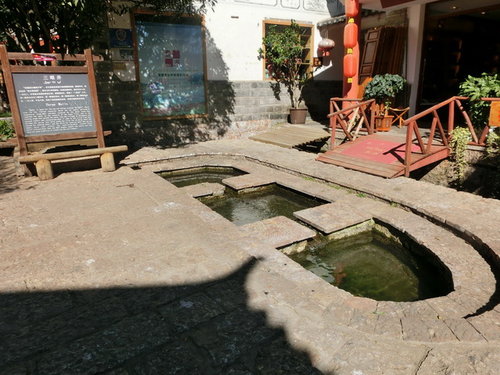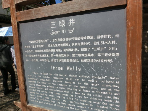 三眼井是麗江地區古老的節水方式的體現,利用水的流勢,由上而下共作了三口井潭,水由最上面的第一口潭一直向下,流到第三口潭後再流走。三眼井是一方小池,隔成三份,第一份做為喝的水,第二份做為洗菜用,第三份用來洗衣服。
