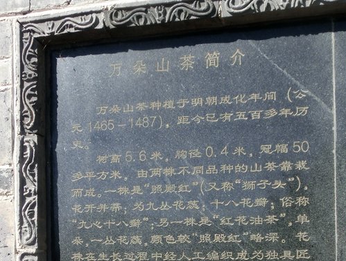 玉峰寺寺內有一棵被譽為「環球第一樹」、「雲嶺第一枝」的山茶,這便是名揚中外的萬朵山茶。山茶為兩株不同品種的山茶嫁接後成為一體,樹齡近500年,由於它每年開花兩三萬朵,故名「萬朵花茶」。每當春暖花開之時,萬朵茶花競相開放,像絢麗多姿的紅霞交相輝映,映紅了整個寺廟。此時,茶花樹旁遊人如織,爭相拍照留念,場面十分壯觀,無愧於「世界茶花之王」的美稱。