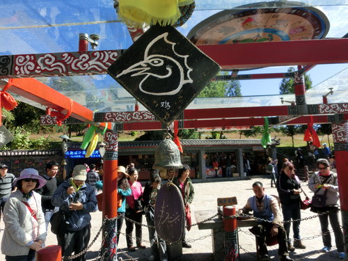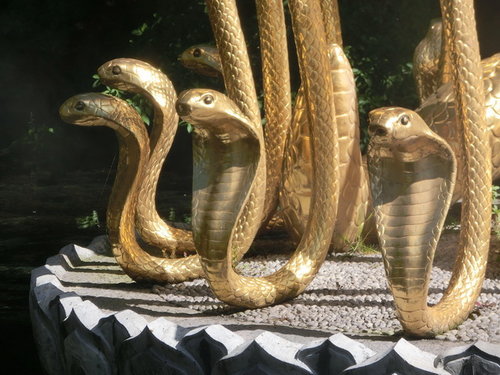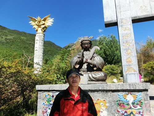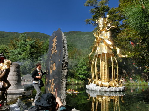 人面蛇身自然神金像坐落在麗江源,身後是清靜幽潭,全身銅胎鍍金,向世人昭示著東巴教具有時代意義的「人與自然和諧相處」「感恩自然、償還欠債」等樸素教義。