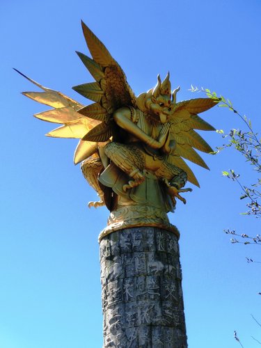 納西族東巴文化中的大鵬神鳥,納西語叫:“都盤修曲”,意為白海螺色的大鵬神鳥。 東巴經書中說大鵬神鳥居住在“居那若羅”神山“含依巴達”神樹上的巢里。在麗江六區及接近藏區的納西人叫他“朵曲格布”,但老東巴說,這是藏語的音譯。大鵬神鳥是納西族東巴教始祖東巴什羅的三大護法神之一,是調解人與自然關係的使者,在納西文化中大鵬神鳥代表著一切正義力量。成為千百年來納西族的保護神,乃至今天成為麗江旅遊的形象代表,從古至今,大鵬神鳥的出現代表著平安吉祥的來臨。
