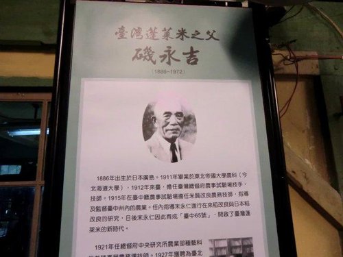 磯永吉,1886年出生於日本廣島。1911年畢業於東北帝國大學農科 (1918年改制為北海道帝國大學,1947年更名為北海道大學),1912年渡海來臺,擔任臺灣總督府農事試驗場的技手,1914年晉升為技師。