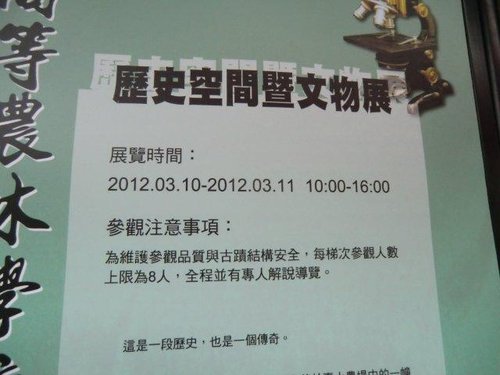 今(2012)年配合臺大杜鵑花節活動,首度開放一般民眾參觀。除展出十多件帝大時期珍貴儀器,讓民眾一窺早期農學研究室的風貌外,同時展出數種目前臺灣具代表性的稻米品種,並搭配米飯品嚐活動,讓參觀的民眾能更深入認識這個每天出現在餐桌上的臺灣蓬萊米的故事。本次活動同時將舉辦奇美博物館捐贈的蓬萊米之父-磯永吉教授與蓬萊米之母末永仁銅像揭幕儀式。