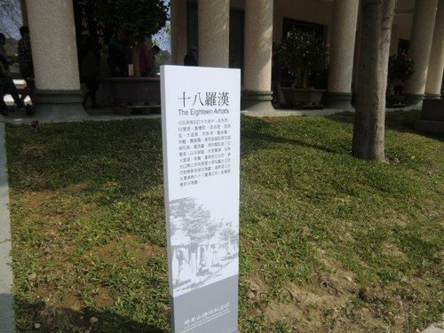 此十八尊平均約三米高的羅漢造像,依藝術家吳榮賜木雕作品,採用廣東古田青斗石鑿刻,多位信徒發心供奉,二○一 一年完成。從此安座於佛陀紀念館之菩提廣場兩側,護佑大眾。