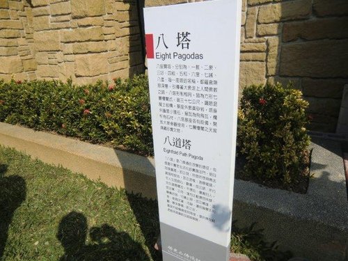 八塔位於成佛大道兩側,是八座中國樓閣式塔,各高三十八公尺。外觀簡潔樸素,沒有繁複的斗拱、彩繪、雕花,也沒有華麗的琉璃、飛簷,色調很寧靜,氣勢昂藏而祥和。星雲大師為這八座塔各取了名字,八個名字組合起來,畫出一個佛教修行的整體輪廓,可以助人修持、讓人領悟成佛。