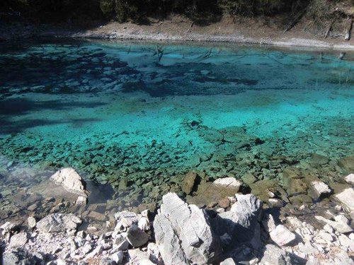 從長海下行1公里即為五彩池,五彩池海拔2995米,深6.6米,深藏於公路下邊的深谷中。五彩池雖在九寨溝眾海中最小巧玲瓏,然而它的色彩卻是最為斑斕,與五花海不相上下。五彩池異常清澈,透過池水,可見到池底岩面的石紋,由於池底沉澱物的色差以及池畔植物色彩的不同,原本湛藍色的湖面變得五彩斑斕。是九寨溝湖泊中的精粹,也是最精緻的海子,被人稱為九寨之眼。