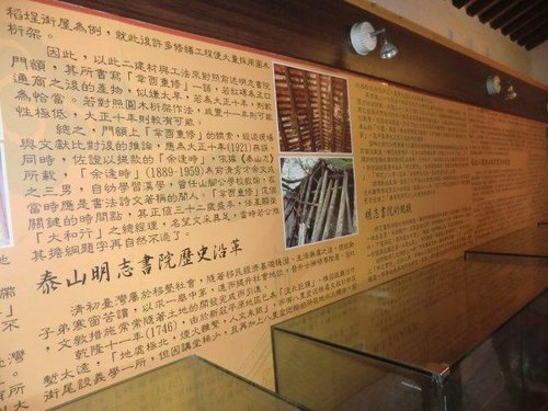 原本規模相當大的明志書院,約可容納百餘人,但因年久失修而倒塌,1921年泰山士紳發起募捐重建,囿限於經費之故,僅改建為一進三間的規模。書院曾被指定為二級古蹟,因長期疏於管理,民國74年(1985),遭內政部解除其古蹟身份。民國92年(2003)6月24日,明志書院因為年久失修,書院屋頂樑柱腐朽倒塌,遂於同年11月開始重修,民國94年(2005)9月28日重新啟用,現為新北市歷史建築。