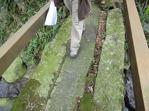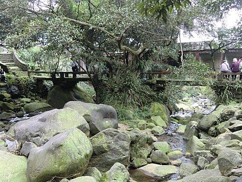 三板橋位於大屯溪上游,店子里菜公坑與圓山里的交界處,橋樑橫跨大屯溪,分三段皆以石板架設而成,故稱三板橋,也是大屯溪古道在北新莊的入口。在清朝時,是通往淡水的要道,更是經濟物資運出的通道,如今這座具有上百年歷史的橋樑,雖已不復當時的地位,但仍可看出當時橋的原貌,實屬不易,已被列為市定古蹟。此處擁有大屯溪自然之美,流水潺潺,兩旁更是翠綠盎然,群山環抱,古木參天,美不勝收。