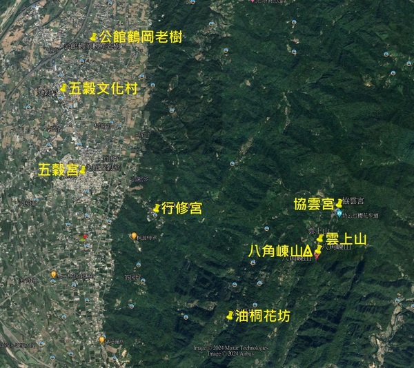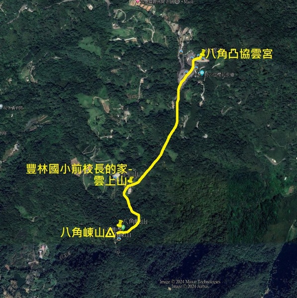 八角崠山位於苗栗縣公館鄉和獅潭鄉的交界處,為苗栗八景「三台疊翠」中間部位:底台-墨硯山,中台-八角崠山,高台-加里山脈。登山步道西側入口以行修寺為起點分北、中、南三路橫向貫通山頂,終點為協雲宮,沿途櫻花、李花、相思林、梅林夾道,綠意盎然。距協雲宮約數百公尺處即是登山口停車場,這裡可以俯瞰另一個苗栗八景-蛤市浮雲。山頂觀景平台上有三等三角點,標高751公尺,台上視野遼闊展望極佳,可眺望整個公館盆地;若時值冬春交接時季,山雲飄渺谷霧不散,如夢如幻頗似仙境,現已規劃為八角崠風景區。