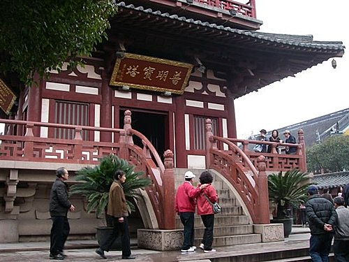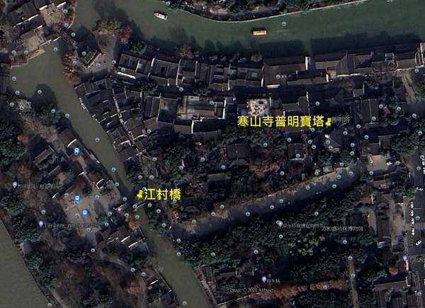 江南名刹寒山寺,自南北朝梁天監年間(西元502-519 年)建寺,舊稱“妙利普明塔院”,隋唐時期盛極一時。1992 年收集建塔資料,進行分析研究,建築大師張錦秋作技術顧問;1993 年完成設計;1995 年高逾42 米的五級四面樓閣式仿唐佛塔“普明寶塔”落成,成為楓橋景區的標誌性建築。項目成員分別對遠景、中景、近景三個範圍內設25 個點進行觀察分析,最後確定以寒山寺大雄寶殿東西中軸線為塔軸心,將塔建在藏經樓後、前寺院、後塔院,符合前殿后塔的佈局。建成的普明塔院占地約3 千方,平面呈回字形,聳立於院中央花崗岩平臺之上。塔式仿“唐式”最合乎寒山寺的歷史。