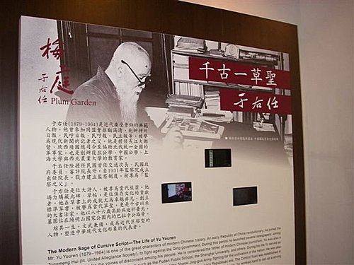 「千古一草聖」展區是有關於于右任的詳細介紹。近代備受世人景仰的于右任,綜觀其一生,文武兼備,是塑造中華現代文化形象的代表者。他曾參加同盟會,推翻滿清;北伐時期曾擔任靖國軍總司令,討伐北洋軍閥,協助國民政府統一全國;除曾擔任民國首任交通次長、國民政府委員、審計院長外,在1931年監察院 成立時更出任院長,戮力建立監察制度,被尊為「監察之父」。他也曾創辦多份報紙,被譽為「現代新聞的記者之父」,且是創辦復旦公學、上海大學及西北農業大學的教育家。